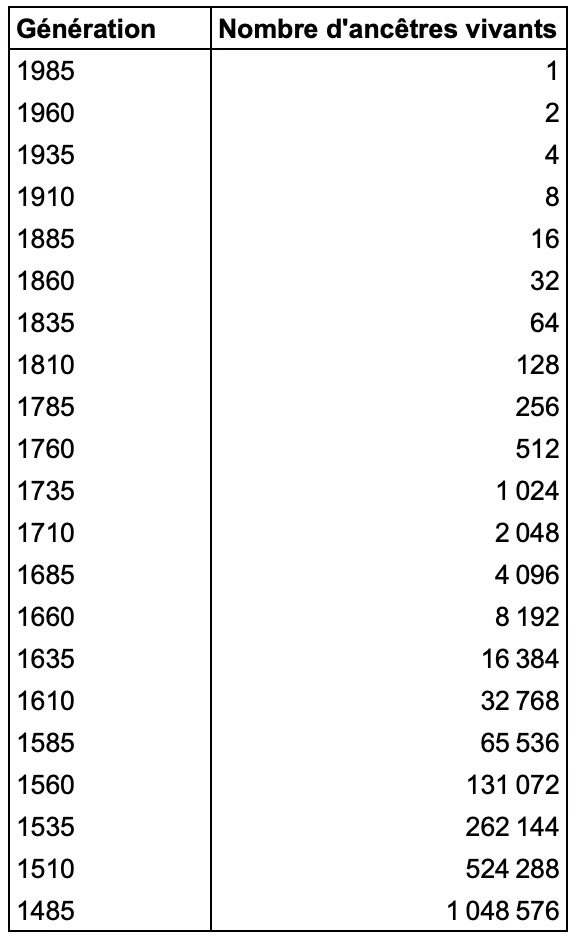 Mais c’est absurde, ils sont beaucoup plus nombreux et tous de même importance d’un point de vue génétique. Faisons le calcul : combien avais-je d’ancêtres vivants aux générations précédentes : 2 parents, 4 arrières-grands-parents…