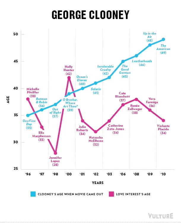 Il y a quelques années, Vulture a analysé les données concernant dix vedettes masculines d'âge mûr et les âges des femmes qu'ils ont courtisées à l'écran. Les résultats sont édifiants, à mesure que les vedettes masculines vieillissent, l'âge de leurs partenaires à l'écran diminue ou reste inchangé.