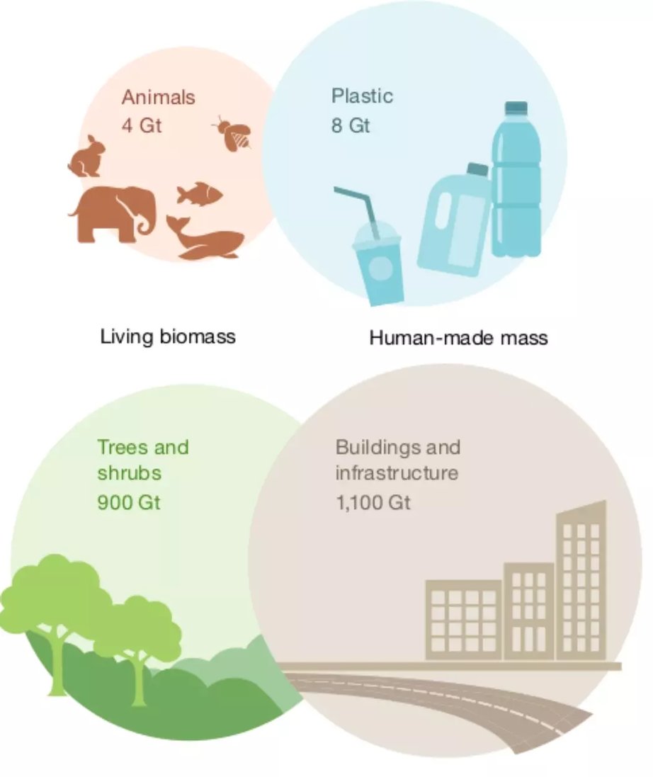 En 2020, une étude de l’Institut Weizmann a montré que la masse des objets fabriqués par les humains (béton, plastique, verre, acier) dépasse désormais celle de tous les êtres vivants réunis sur Terre.