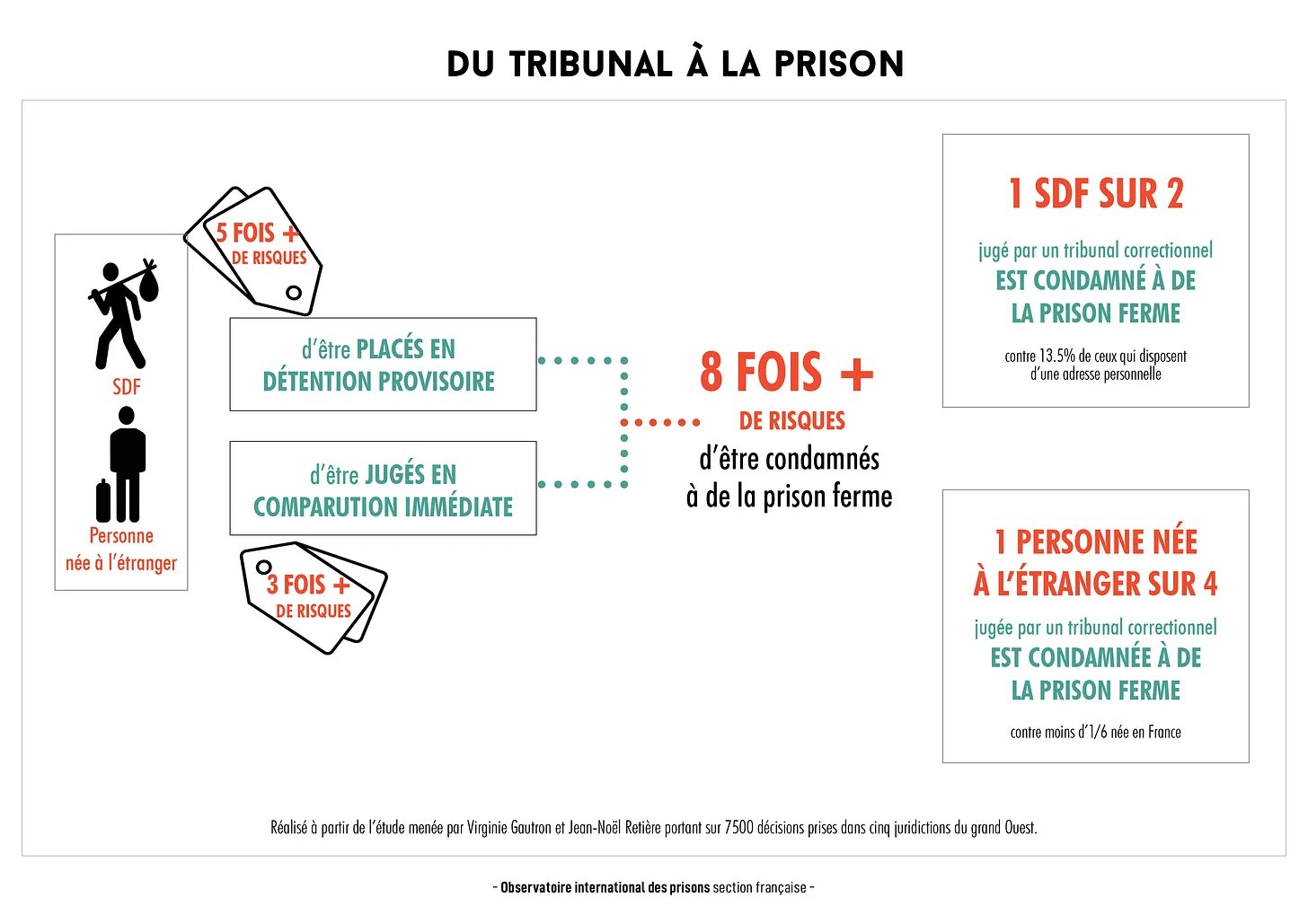un prévenu qui touche moins de 300 € par mois a trois fois plus de chances d’être condamné à du ferme que quelqu’un qui gagne 1 500 € ou plus.